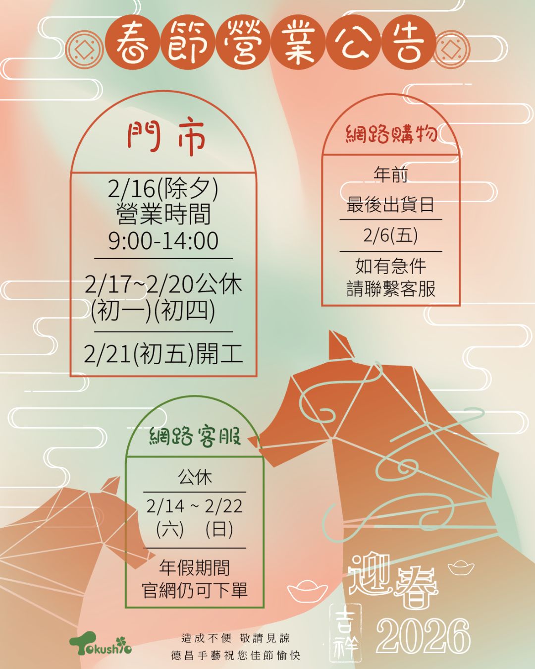 最新消息 首頁 > 最新消息 2026-02-05 【2026春節-服務時間異動公告】 因春節即將來臨 門市與網路部皆有不同的營業異動 詳情請看下方圖 春節期間,官網仍可下訂單哦 造成不便,敬請見諒 德昌手藝祝您跨年愉快 回上一頁 【3月德昌會員日】 【1月德昌會員日】