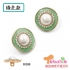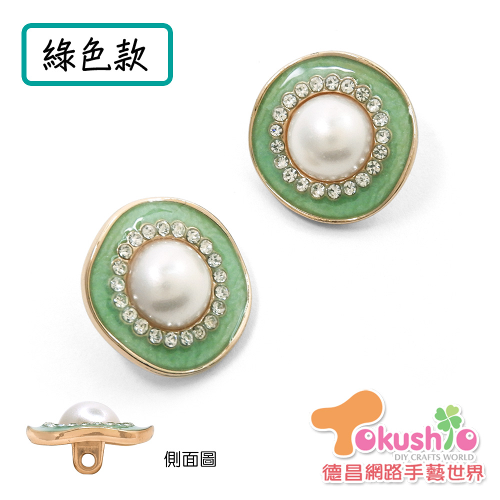 單孔的立腳釦形式,縫合在上衣褲子上均不易被看到縫線,釦面上中心為珍珠圍鑽加上滴油外圈,適合用於各種材質布料的上衣外套,不會顯得太過於花俏醒目。