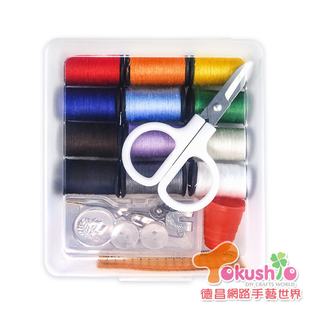 小縫線 黑色1卷(固定色)、白色1卷(固定色)其餘10色(顏色隨機)配件 縫針x2支、褲勾x1組、暗扣x1組、四孔釦x2組穿線片x1個、皮尺x1個、小剪刀x1個、收納盒、指套x1個、別針x1個包裝:每包 1 組 /包