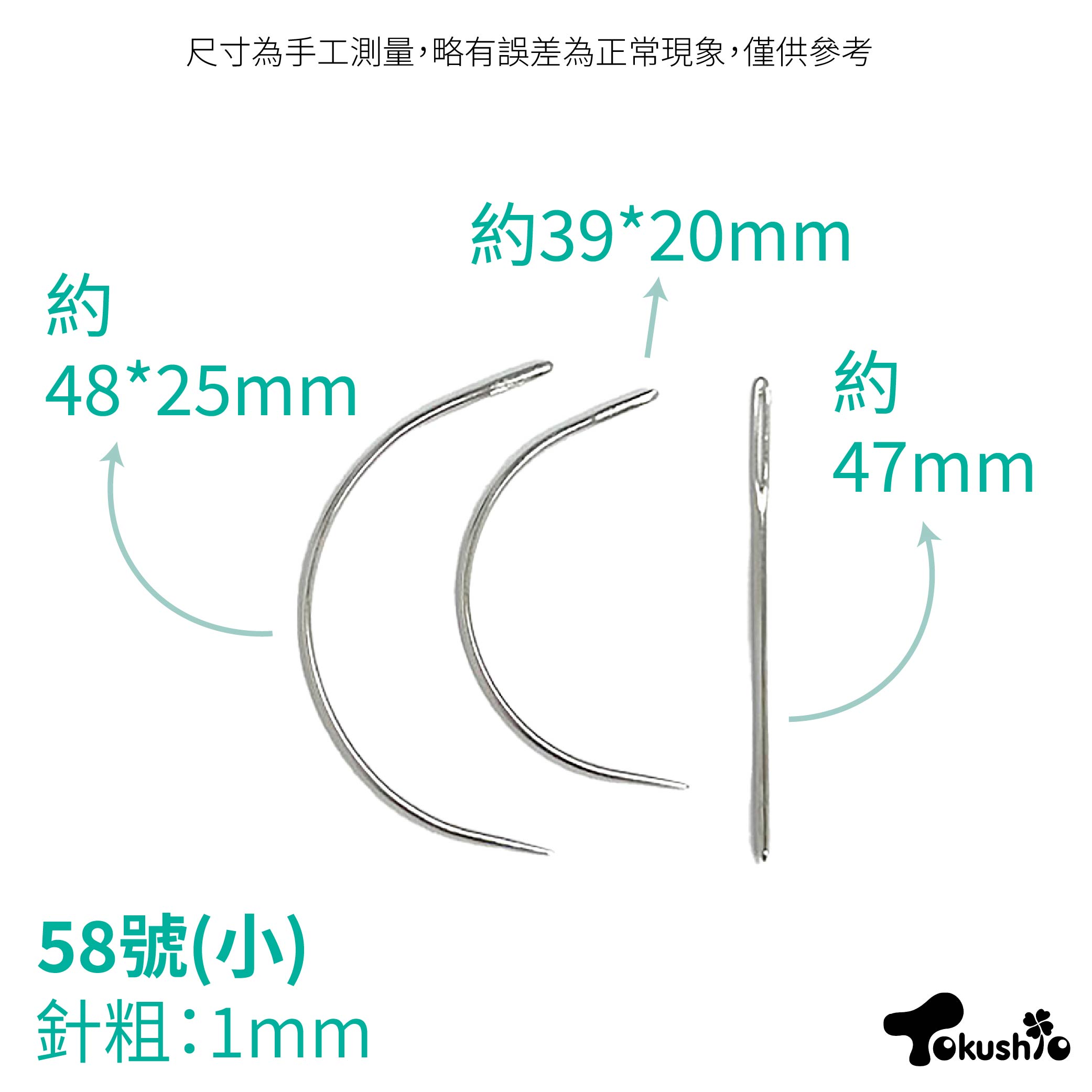 約 47 mm、小彎針約 39*20 mm、大彎針約 48*25 mm